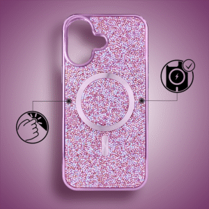 Eleganckie etui z twardym tyłem i błyszczącą ramką, ozdobione wbudowanymi kryształami brokatu. Precyzyjnie dopasowane, responsywne przyciski i podwyższone ranty chronią ekran i obiektyw. Wbudowany MagSafe pozwala korzystać z akcesoriów i ładowarek bezprzewodowych, łącząc stylowy design z pełną ochroną.