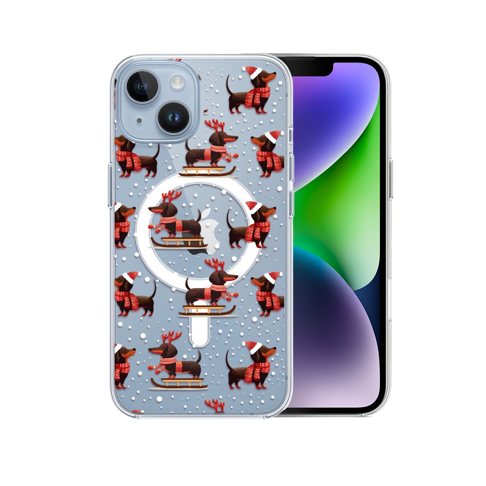 Etui do iPhone 14 Plus z MagSafe, Przytulne święta, Jamniki na saniach, przeźroczyste