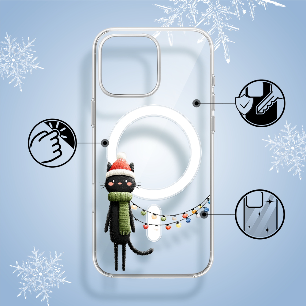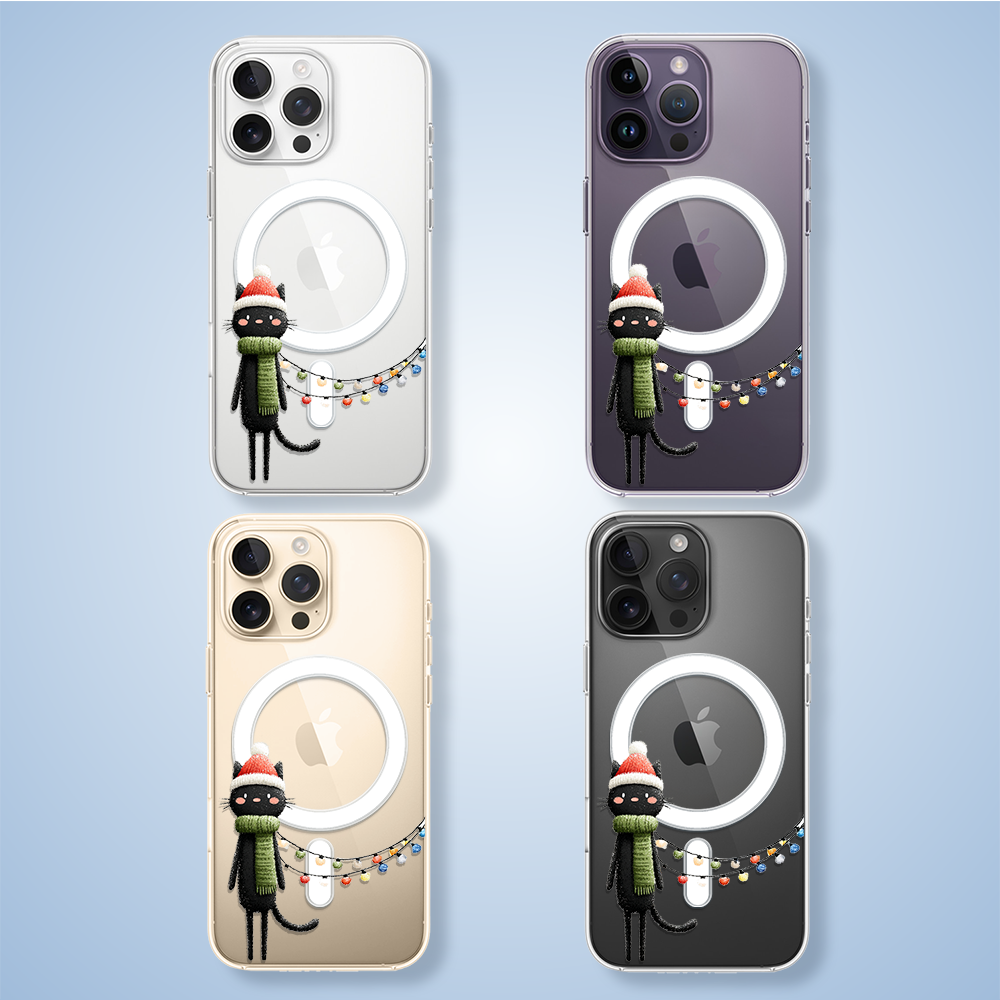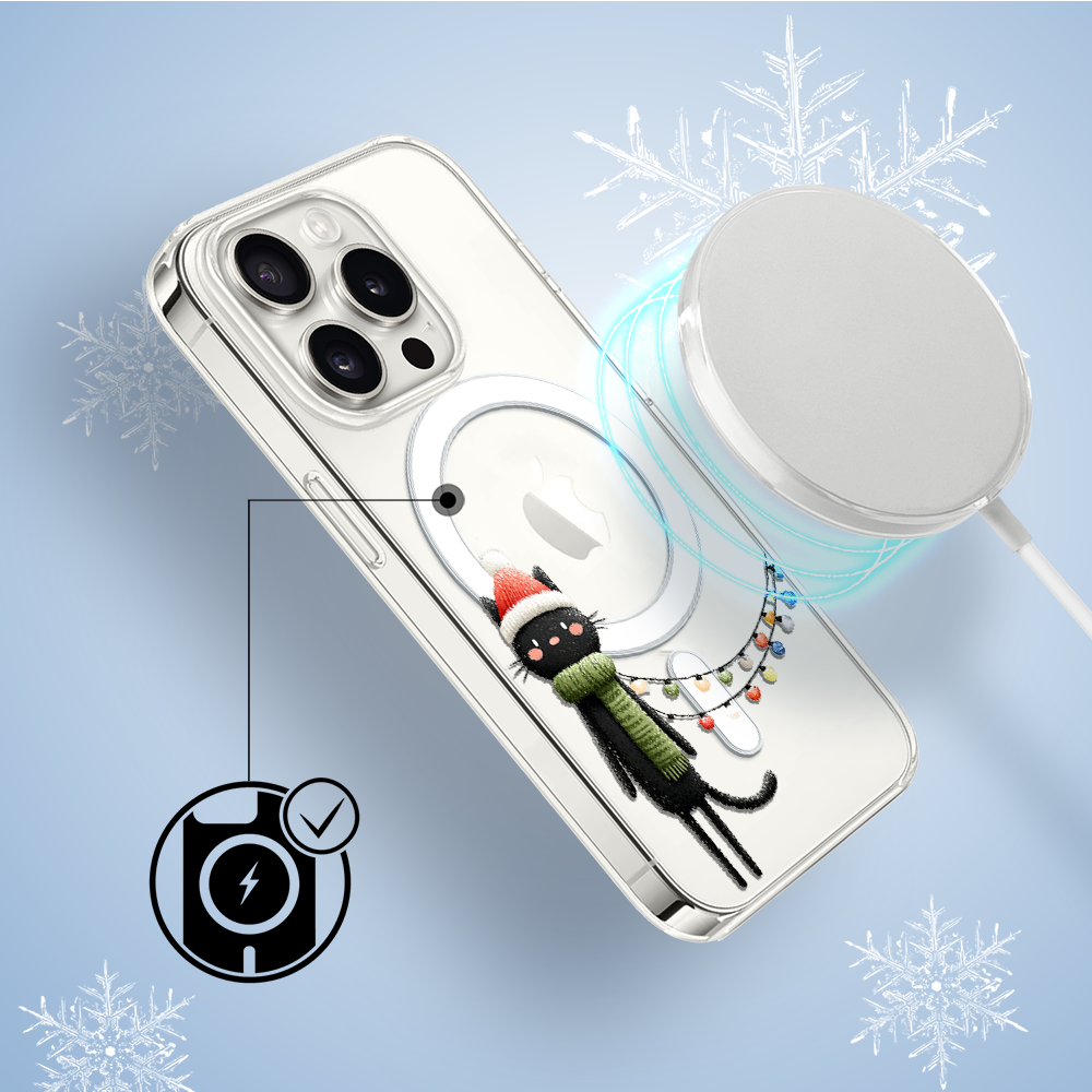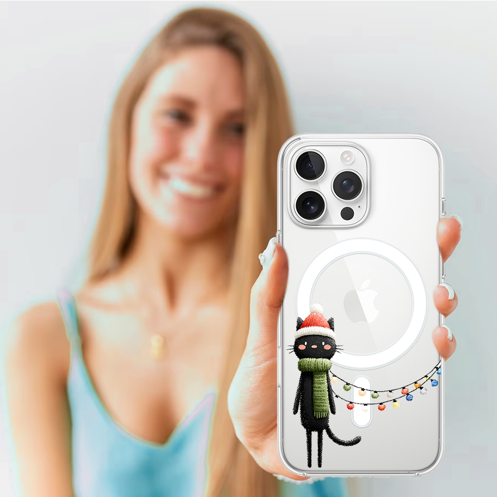 Etui do iPhone 14 Pro z MagSafe, Przytulne święta, Kot przebrany za elfa, przeźroczyste1