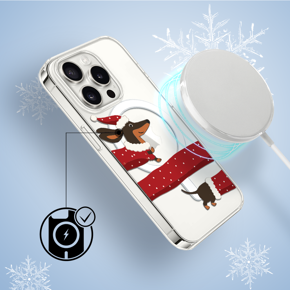 Etui do iPhone 14 Pro z MagSafe, Przytulne święta, Świąteczny jamnik, przeźroczyste2