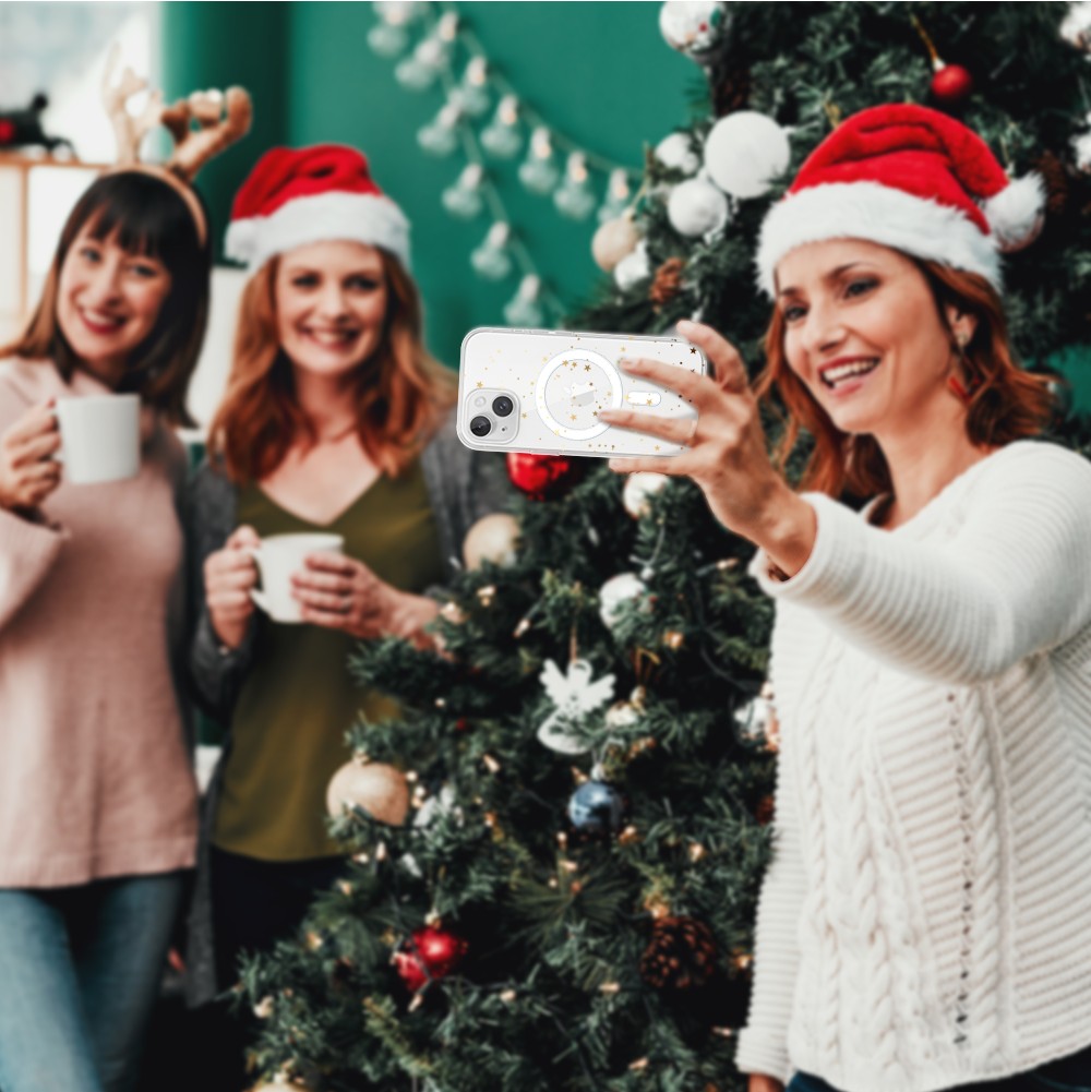 Etui do iPhone 14 z MagSafe, Zimowa Magia, Złote gwiazdki, przeźroczyste1