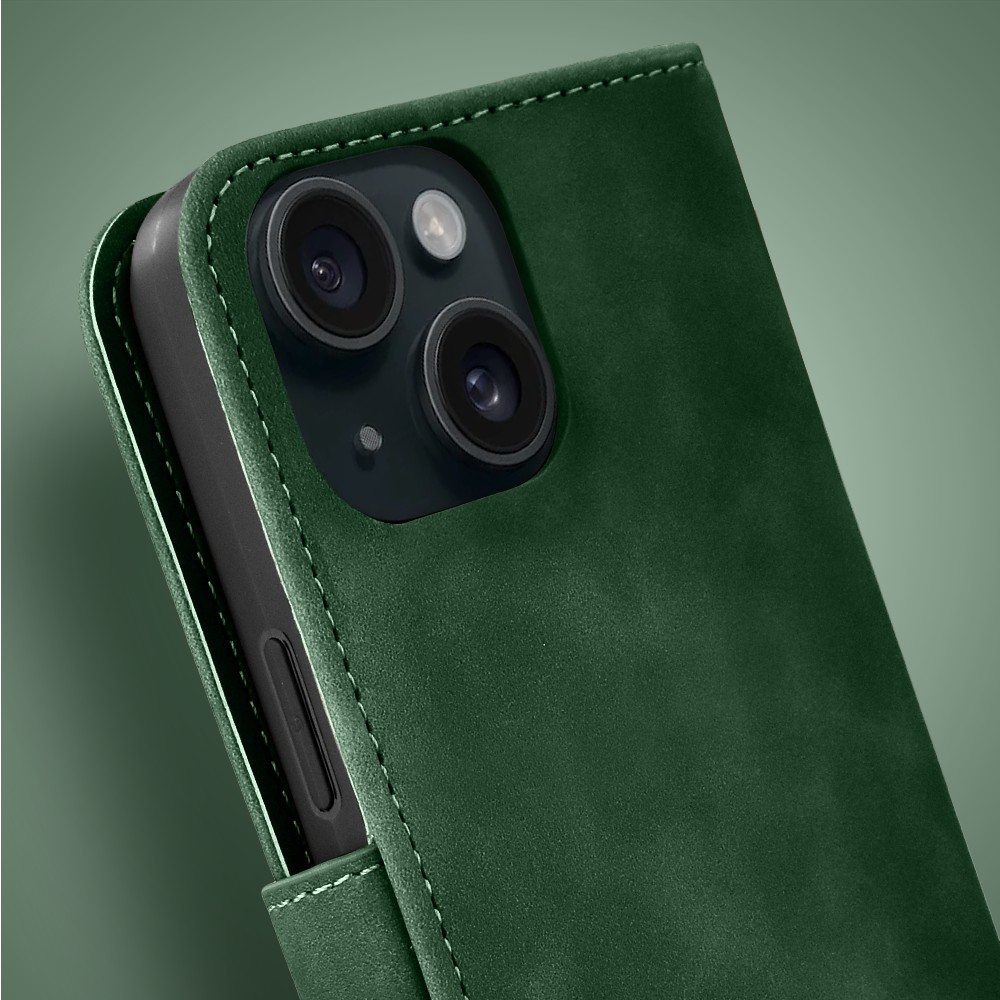 Etui do iPhone 15 książkowe Velvet Touch, aksamitne, portfelowe z zamknięciem, zielone (4)