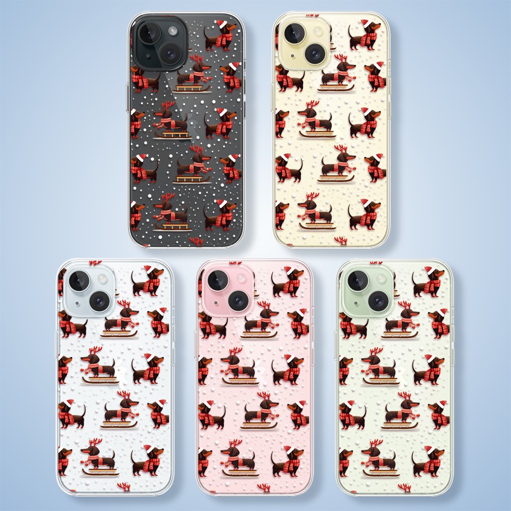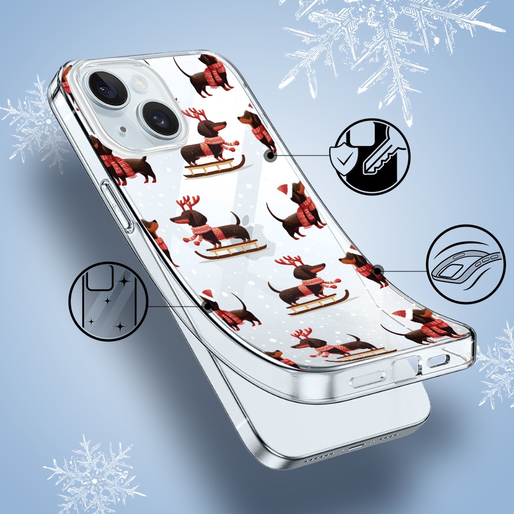 Etuitelefon.pl > Akcesoria do iphone 15 plus > Etui iphone 15 plus > Etui do iphone 15 plus, przytulne święta, jamniki na saniach, przeźroczyste