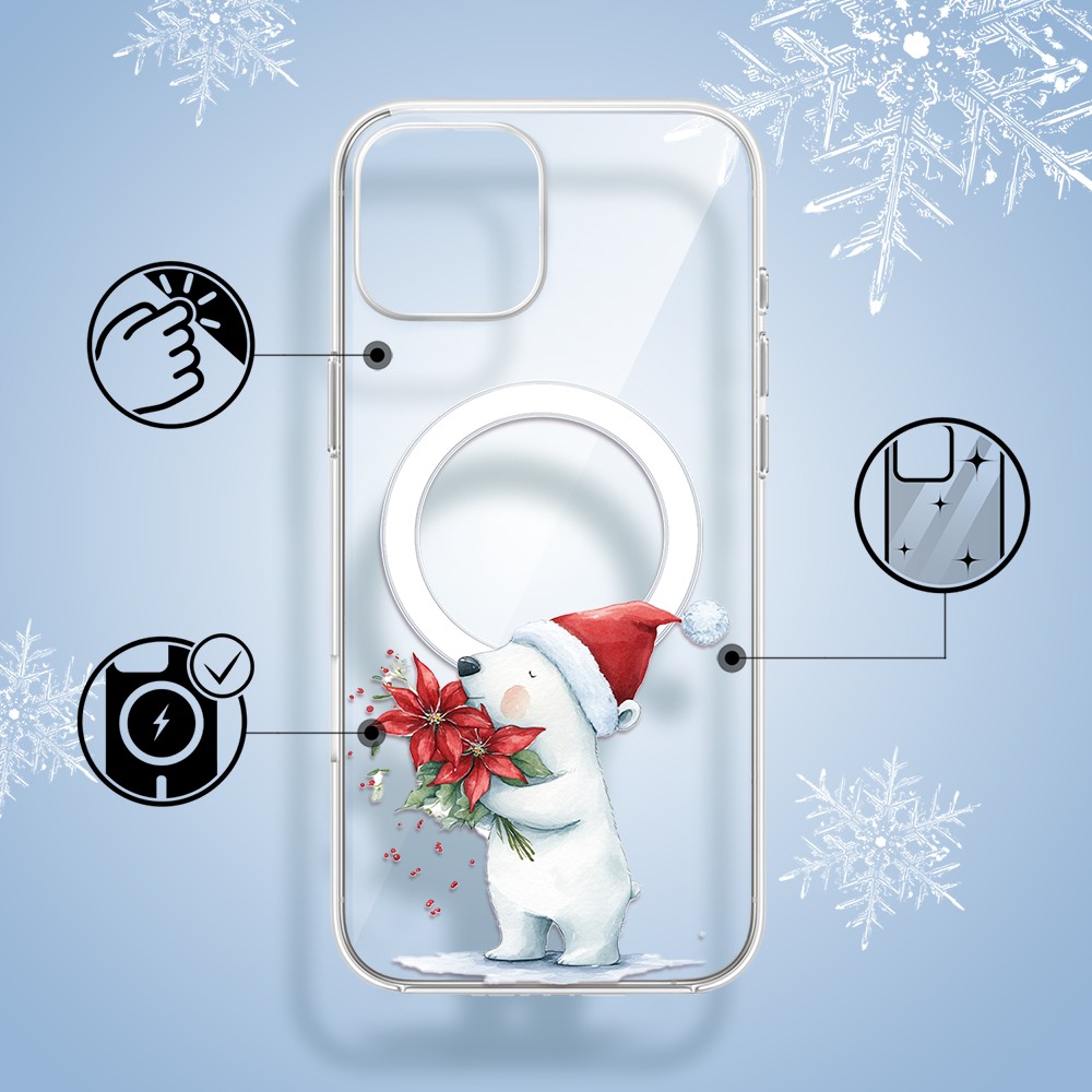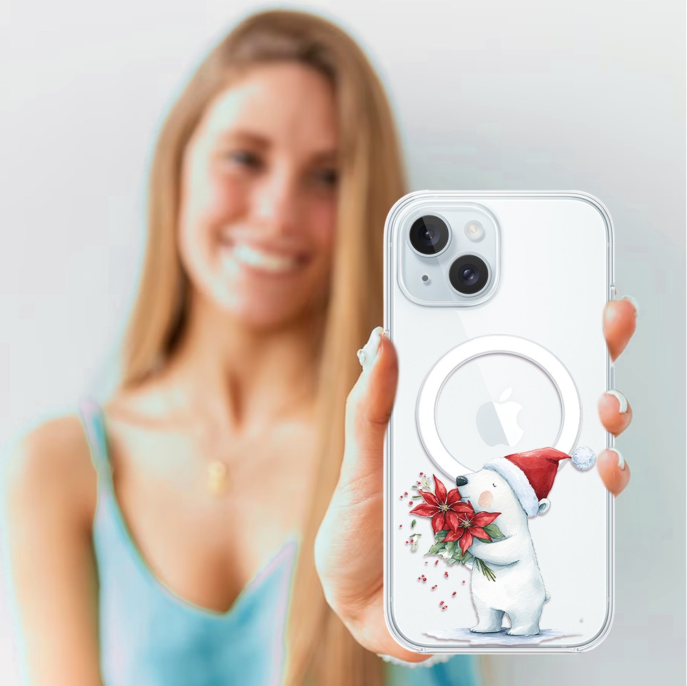 Etuitelefon.pl > Akcesoria do iphone 15 plus > Etui iphone 15 plus > Etui do iphone 15 plus z magsafe, przytulne święta, miś świąteczny, przeźroczyste