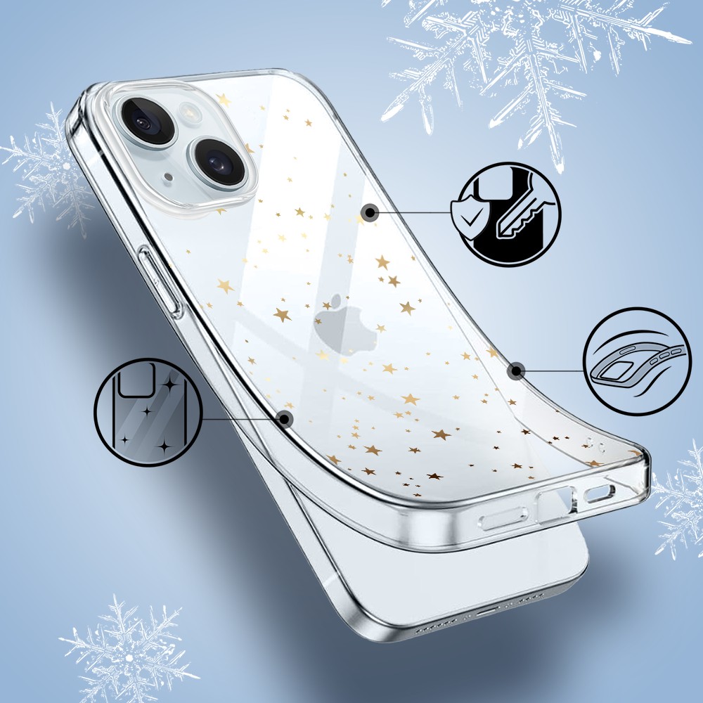 Etui do iPhone 15, Zimowa Magia, Złote gwiazdki, przeźroczyste1