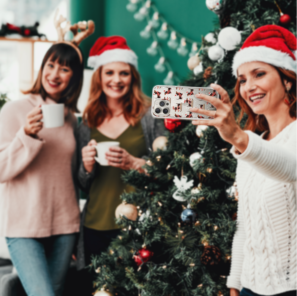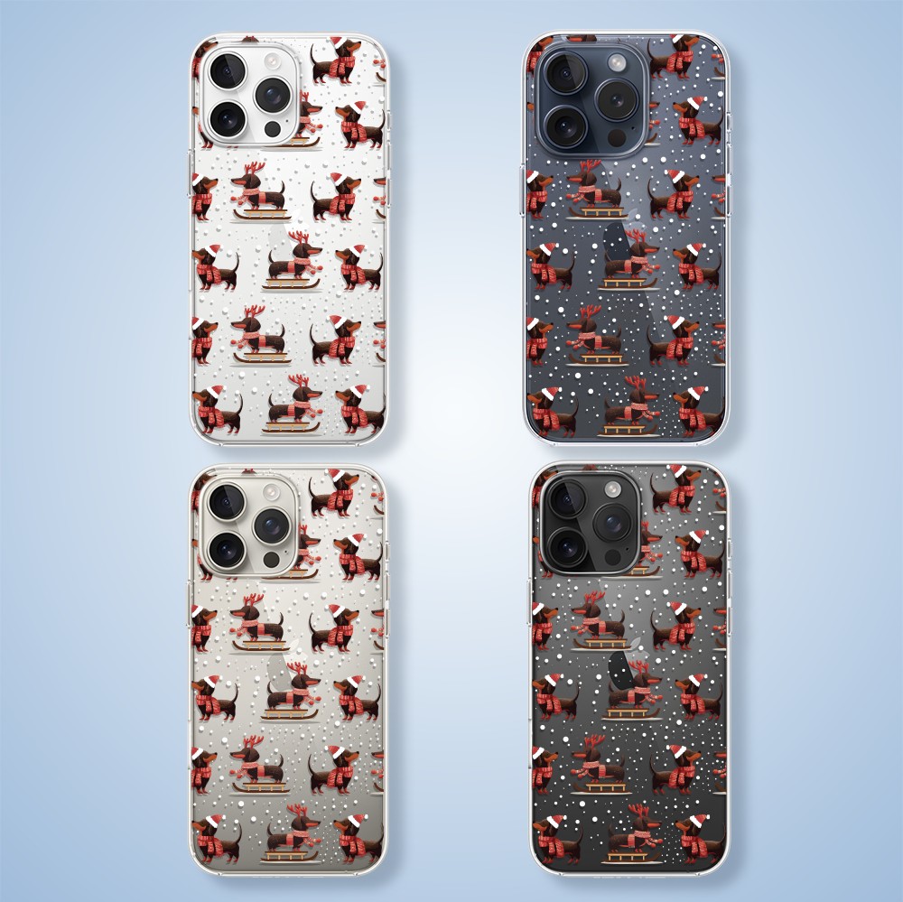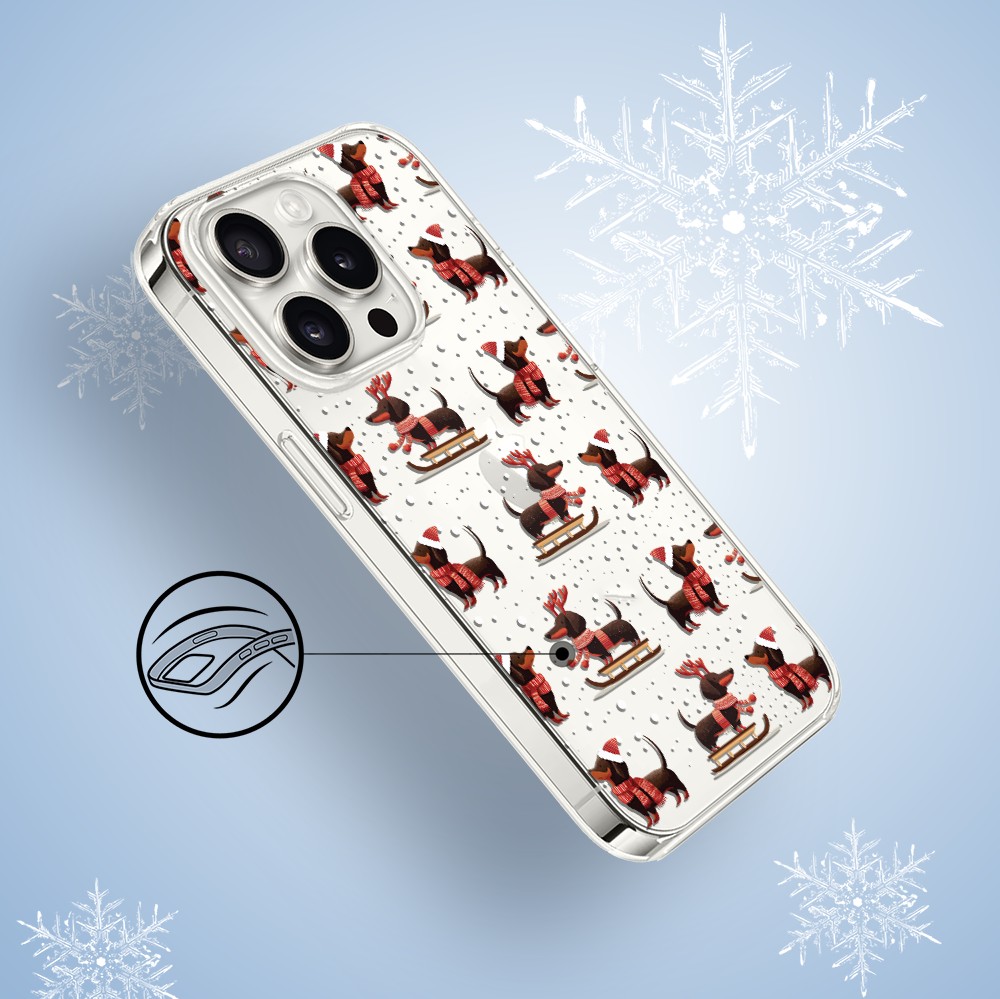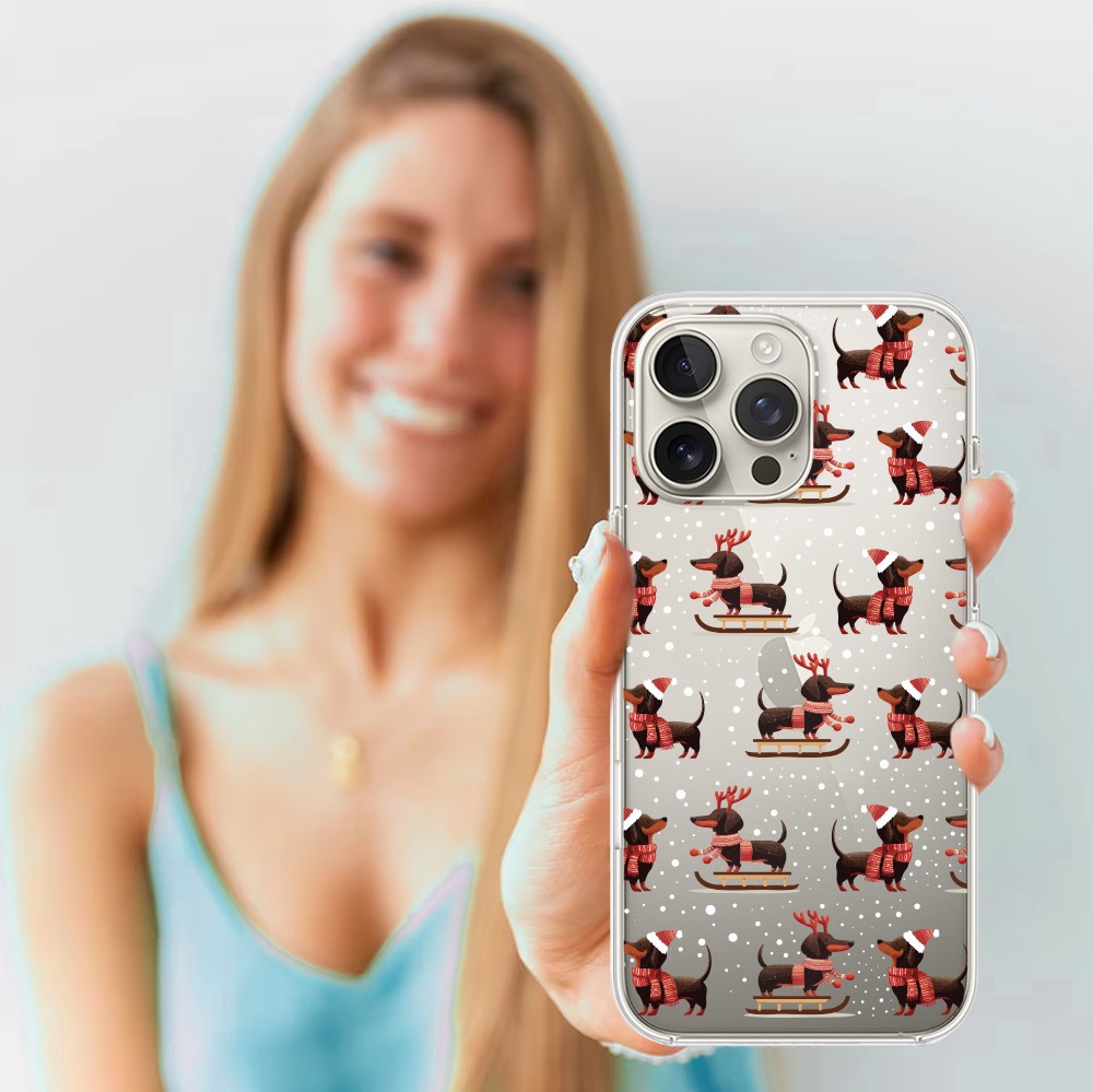 Etuitelefon.pl > Akcesoria do iphone 15 pro max > Etui iphone 15 pro max > Etui do iphone 15 pro max, przytulne święta, jamniki na saniach, przeźroczyste