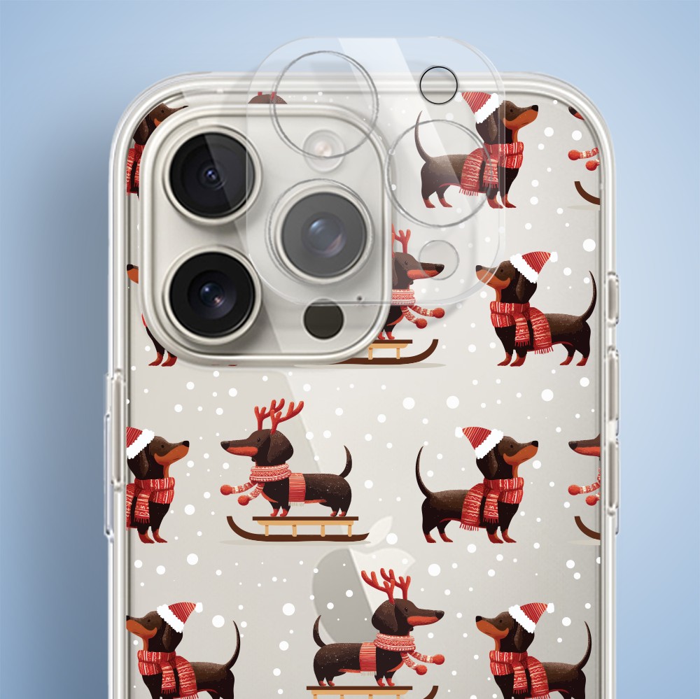 Etui do iPhone 15 Pro, Przytulne święta, Jamniki na saniach, przeźroczyste1