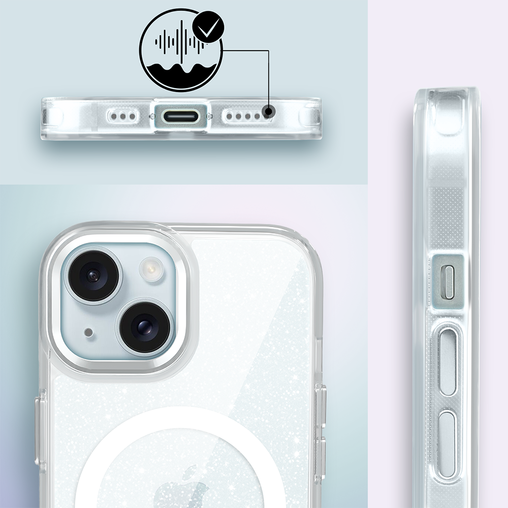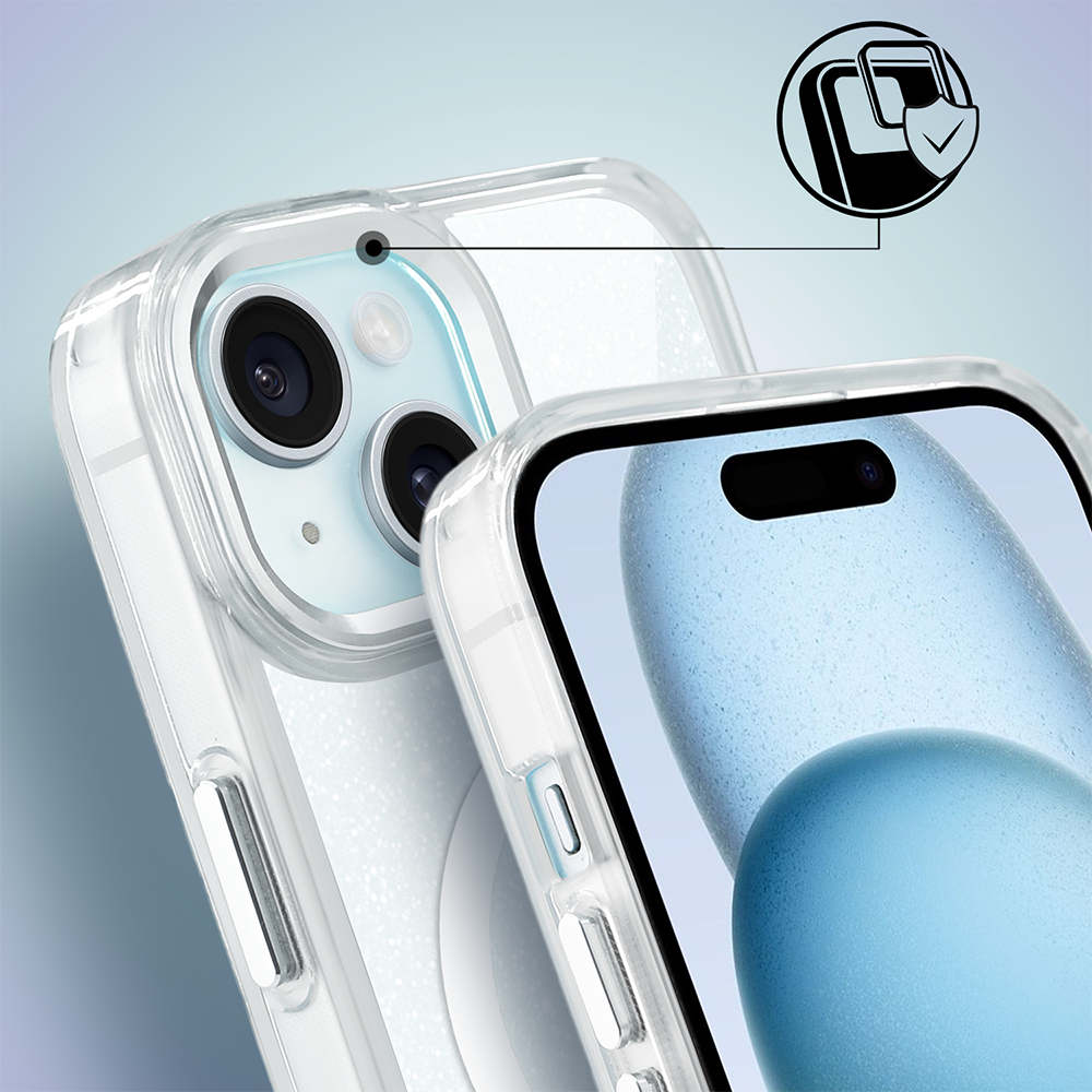 Etui do iPhone 15 Super Hybrid Sparkle z MagSafe, błyszczący, twardy brokatowy tył, metalowe ozdoby, przeźroczyste (2)