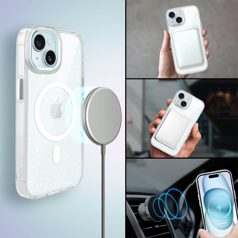 Etui do iPhone 15 Super Hybrid Sparkle z MagSafe, błyszczący, twardy brokatowy tył, metalowe ozdoby, przeźroczyste