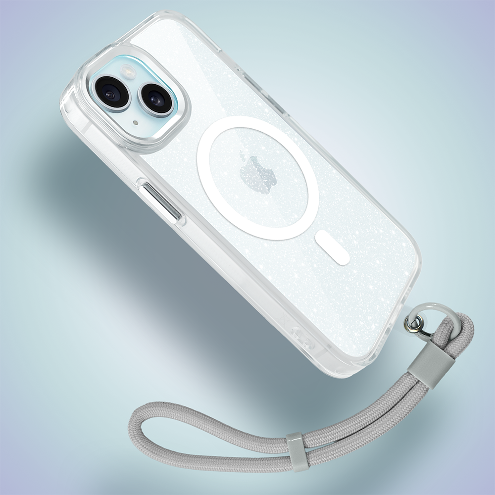 Etui do iPhone 15 Super Hybrid Sparkle z MagSafe, błyszczący, twardy brokatowy tył, metalowe ozdoby, przeźroczyste (1)