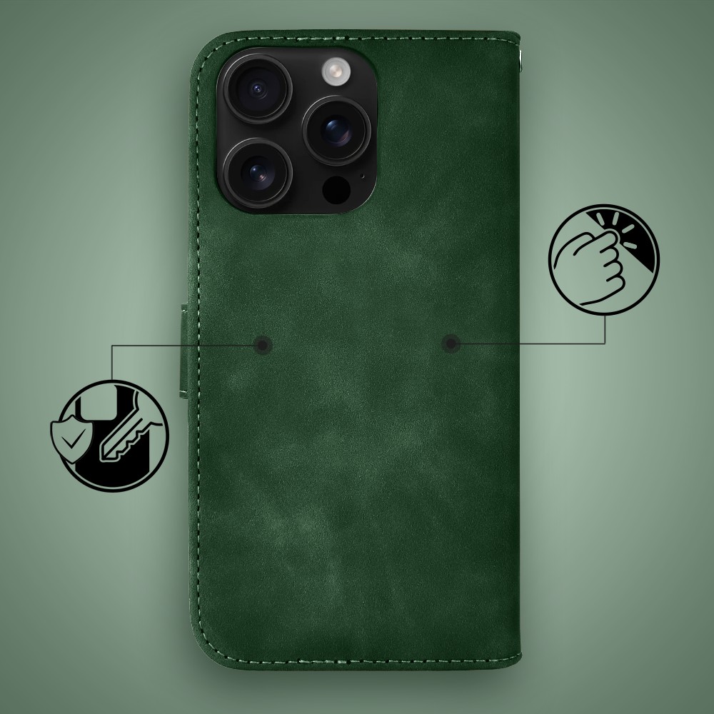 Etui do iPhone 16 Pro książkowe Velvet Touch, aksamitne, portfelowe z zamknięciem, zielone (1)