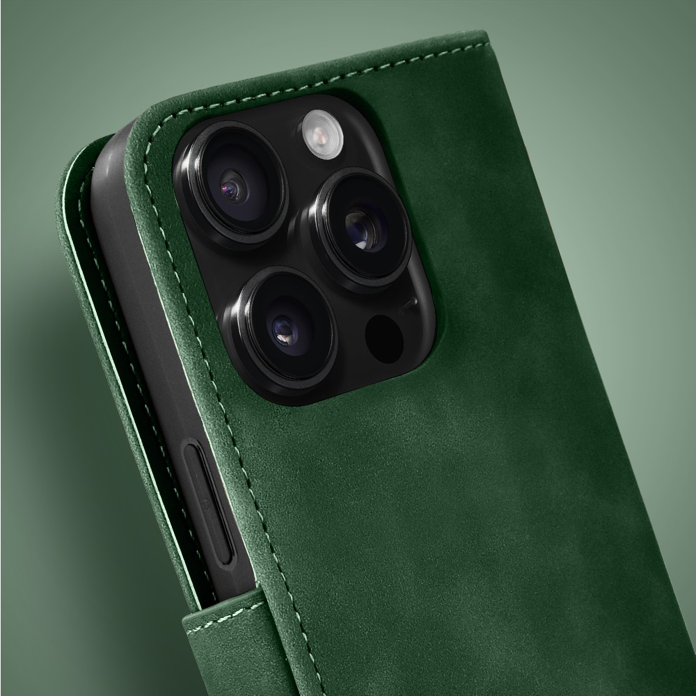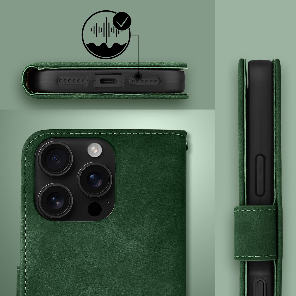 Etui do iPhone 16 Pro książkowe Velvet Touch, aksamitne, portfelowe z zamknięciem, zielone (4)