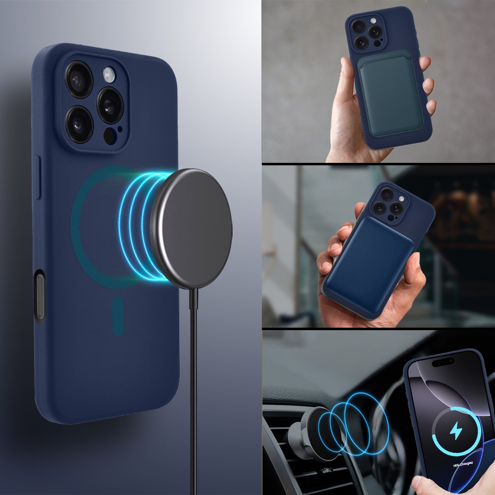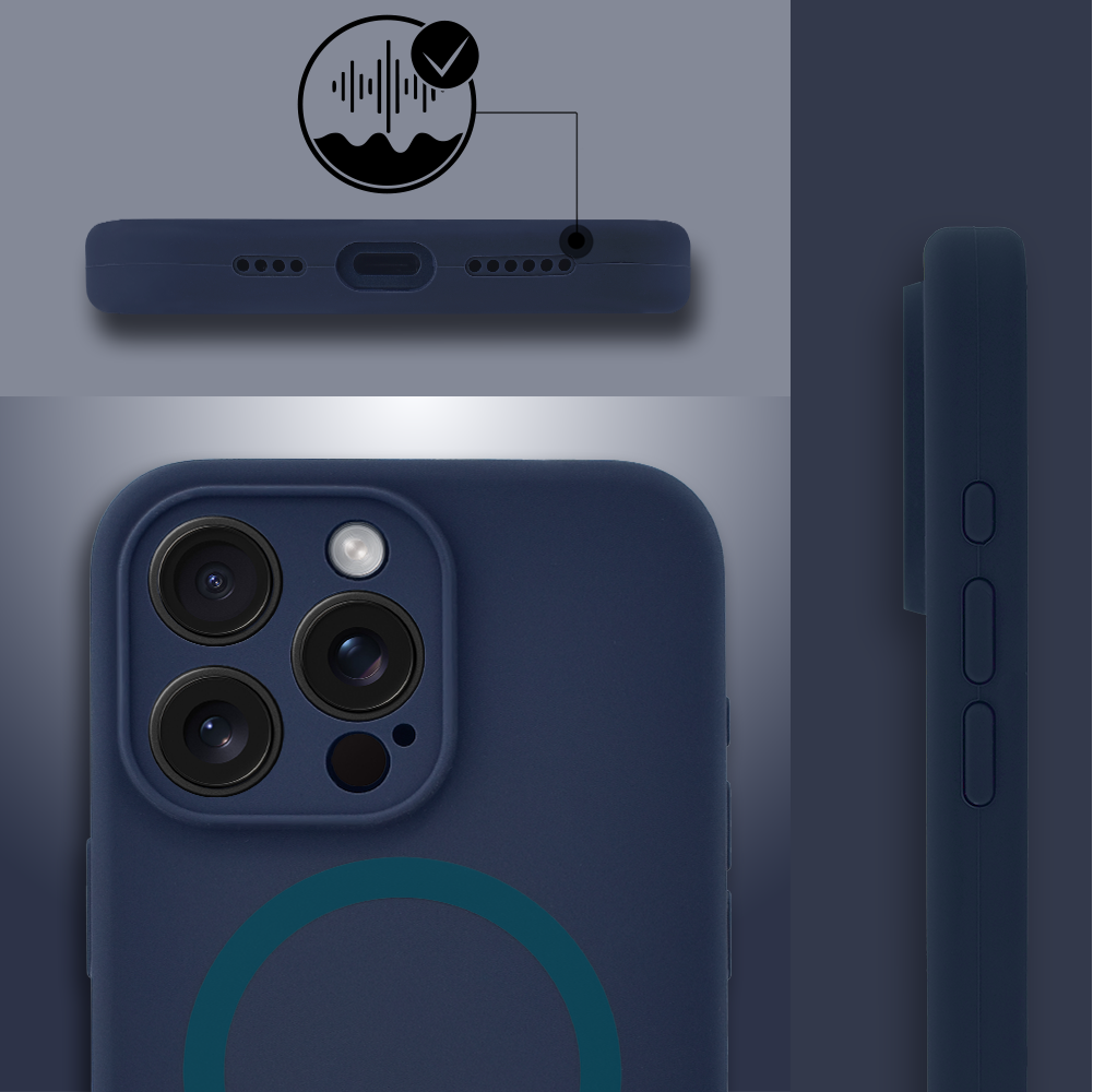 Etui do iPhone 16 Pro Max, silikonowe z MagSafe, mikrofibra soft touch z osłoną na aparat, granatowe