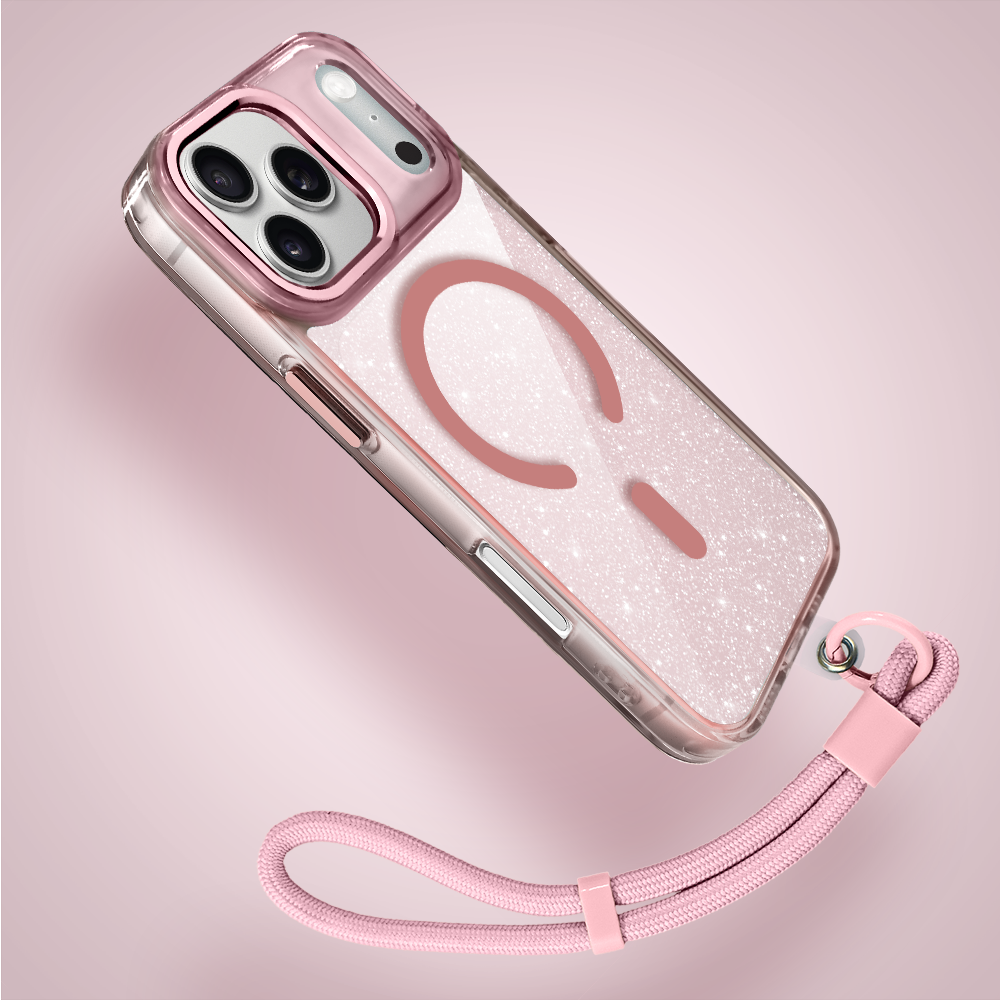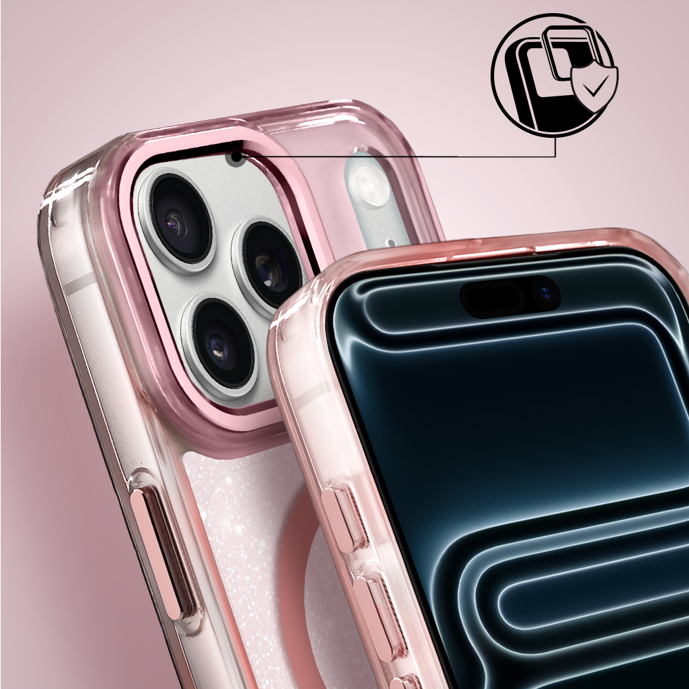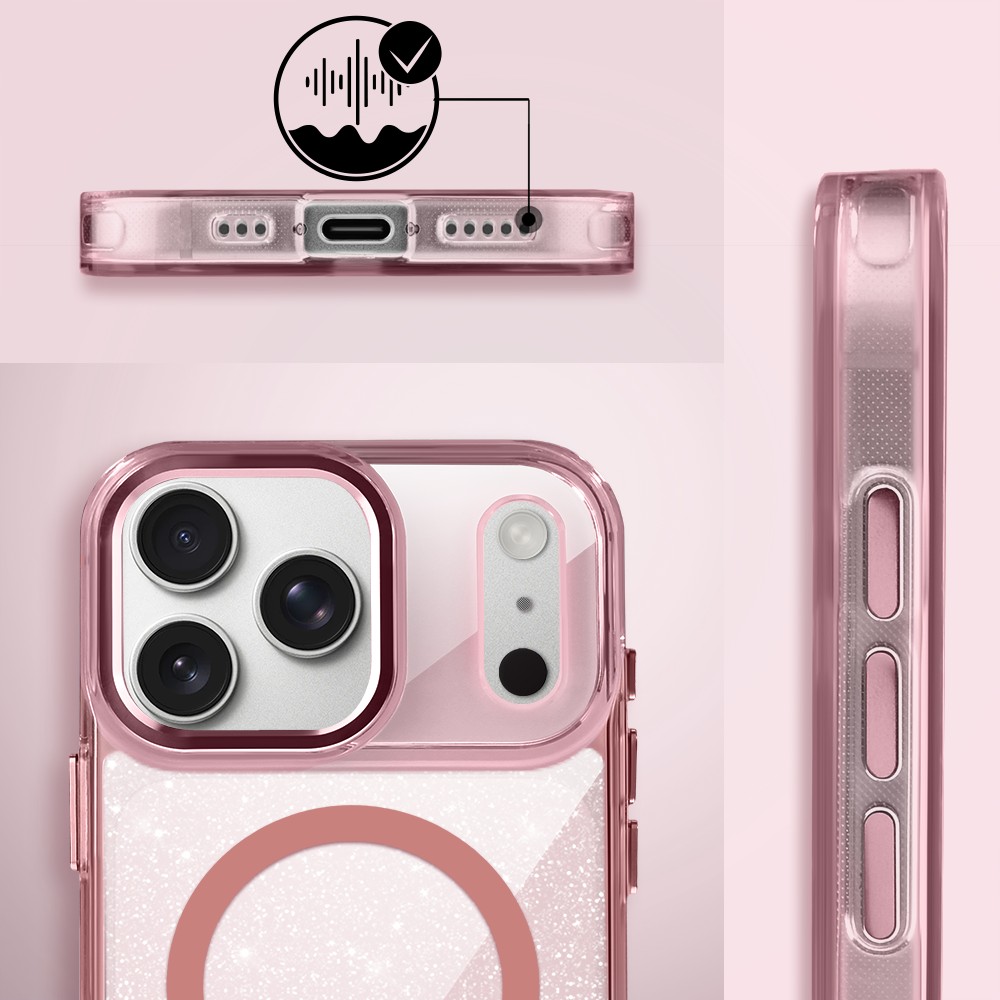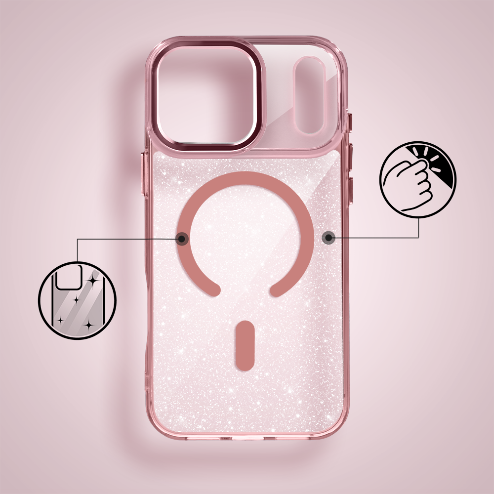 Etui do iPhone 17 Pro Super Hybrid Sparkle z MagSafe, błyszczący, twardy brokatowy tył, metalowe ozdoby, różowe (8)