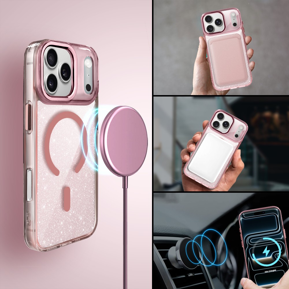 Etui do iPhone 17 Pro Super Hybrid Sparkle z MagSafe, błyszczący, twardy brokatowy tył, metalowe ozdoby, różowe (6)
