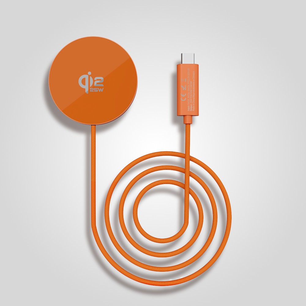 Nowoczesna ładowarka magnetyczna w eleganckim pomarańczowym kolorze łączy w sobie maksymalną wygodę ładowania bezprzewodowego z wyjątkową trwałością i solidnym wykonaniem. Wystarczy położyć telefon na powierzchni ładowarki, aby rozpoczęło się szybkie ładowanie do 25W – bez kabli i zbędnych komplikacji.