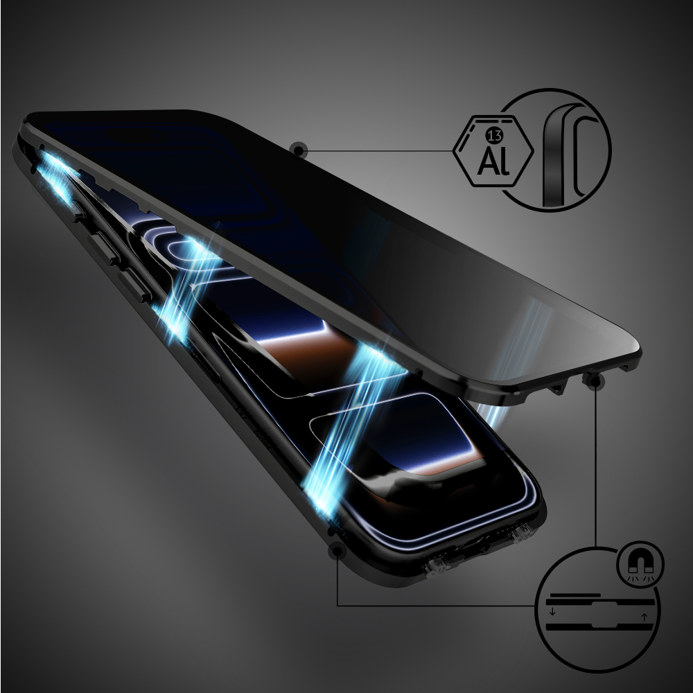 Obudowa do iPhone 17 Pro Max, podwójna szyba i aluminium 360° przód + tył magnetyczna, z osłoną aparatu i szkłem prywatyzującym, czarna (7)