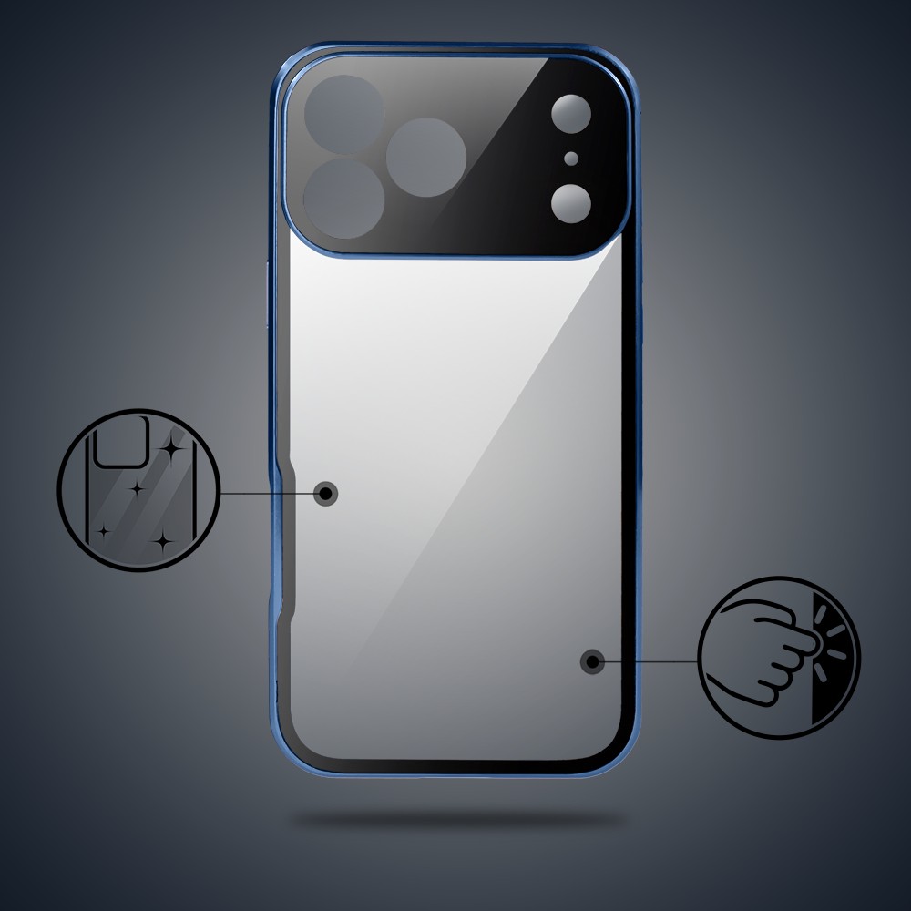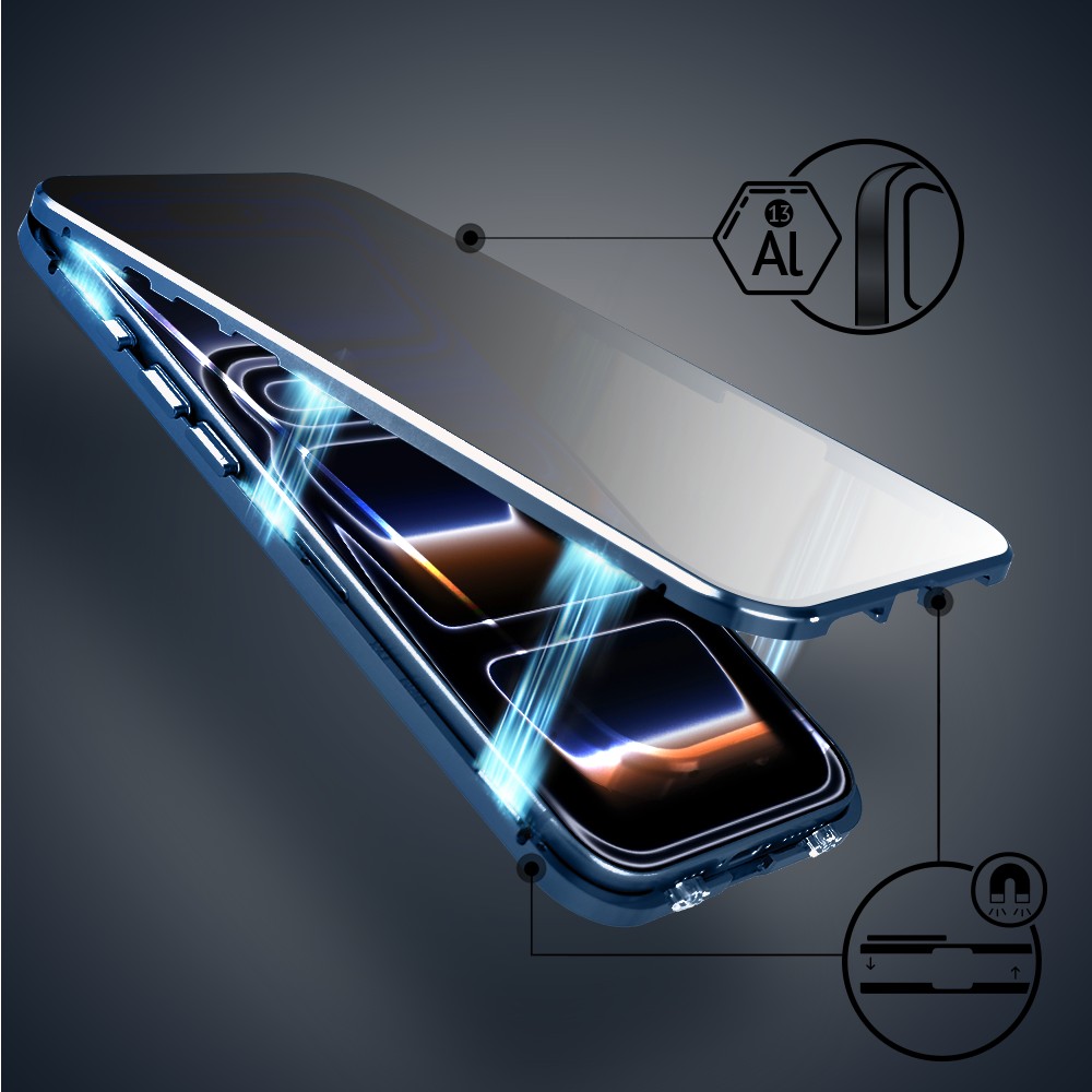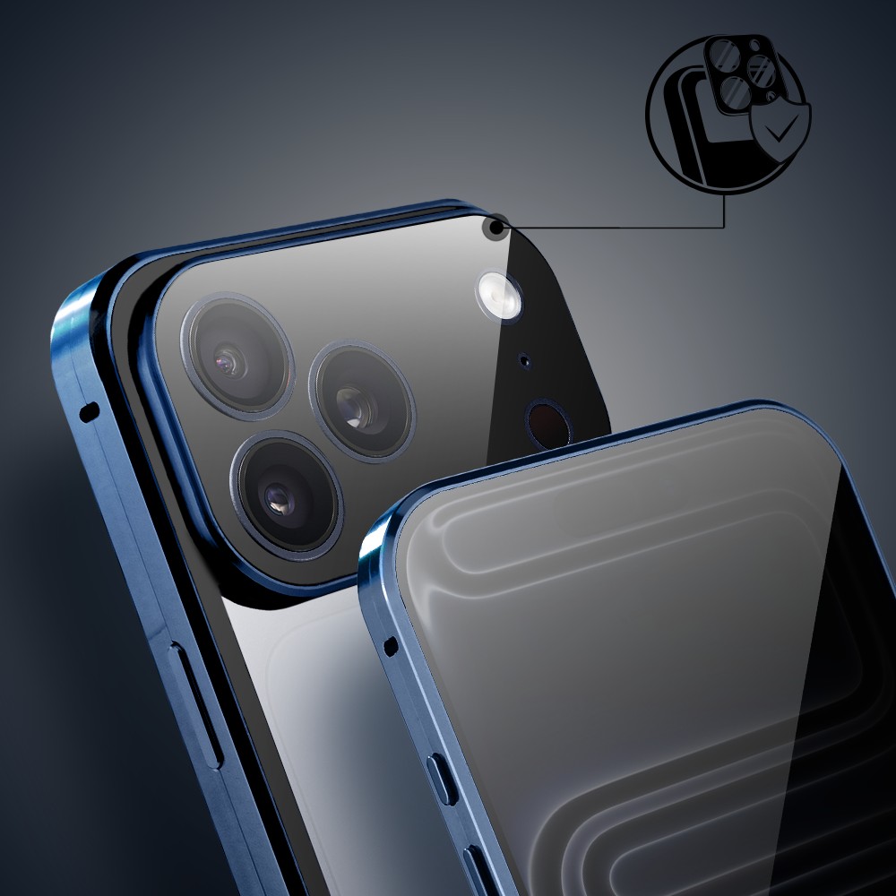 Obudowa do iPhone 17 Pro Max, podwójna szyba i aluminium 360° przód + tył magnetyczna, z osłoną aparatu i szkłem prywatyzującym, granatowa Obszar kompozycji 7
