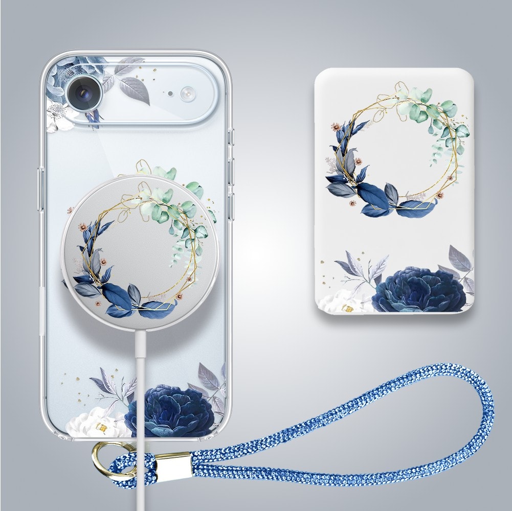 Zestaw etui do iPhone Air, szkło na aparat, power bank, niebieskie kwiaty