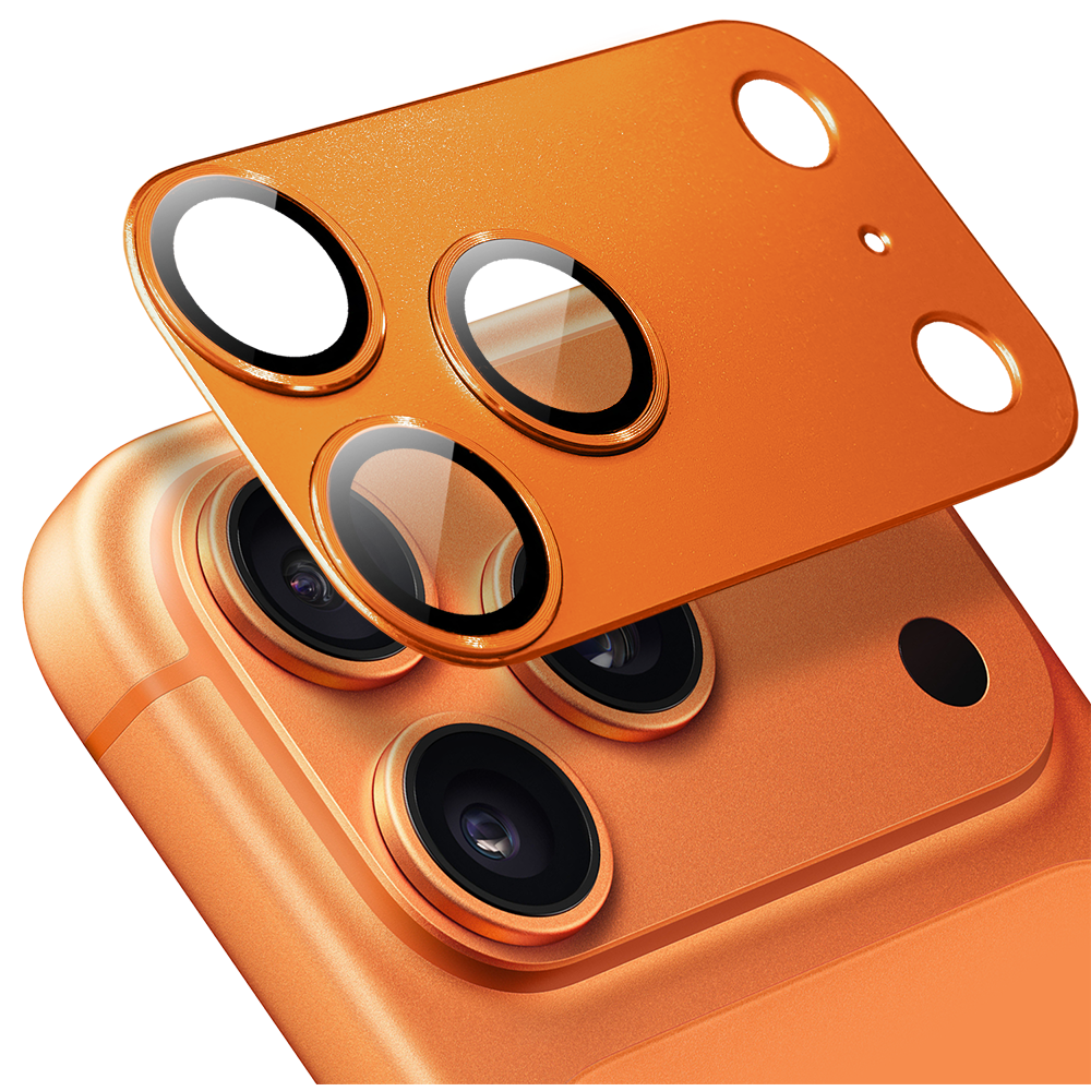 iPhone 17 Pro Max gładka metalowa osłona na cały panel aparatu, wbudowane szkła 9H, pomarańczowa